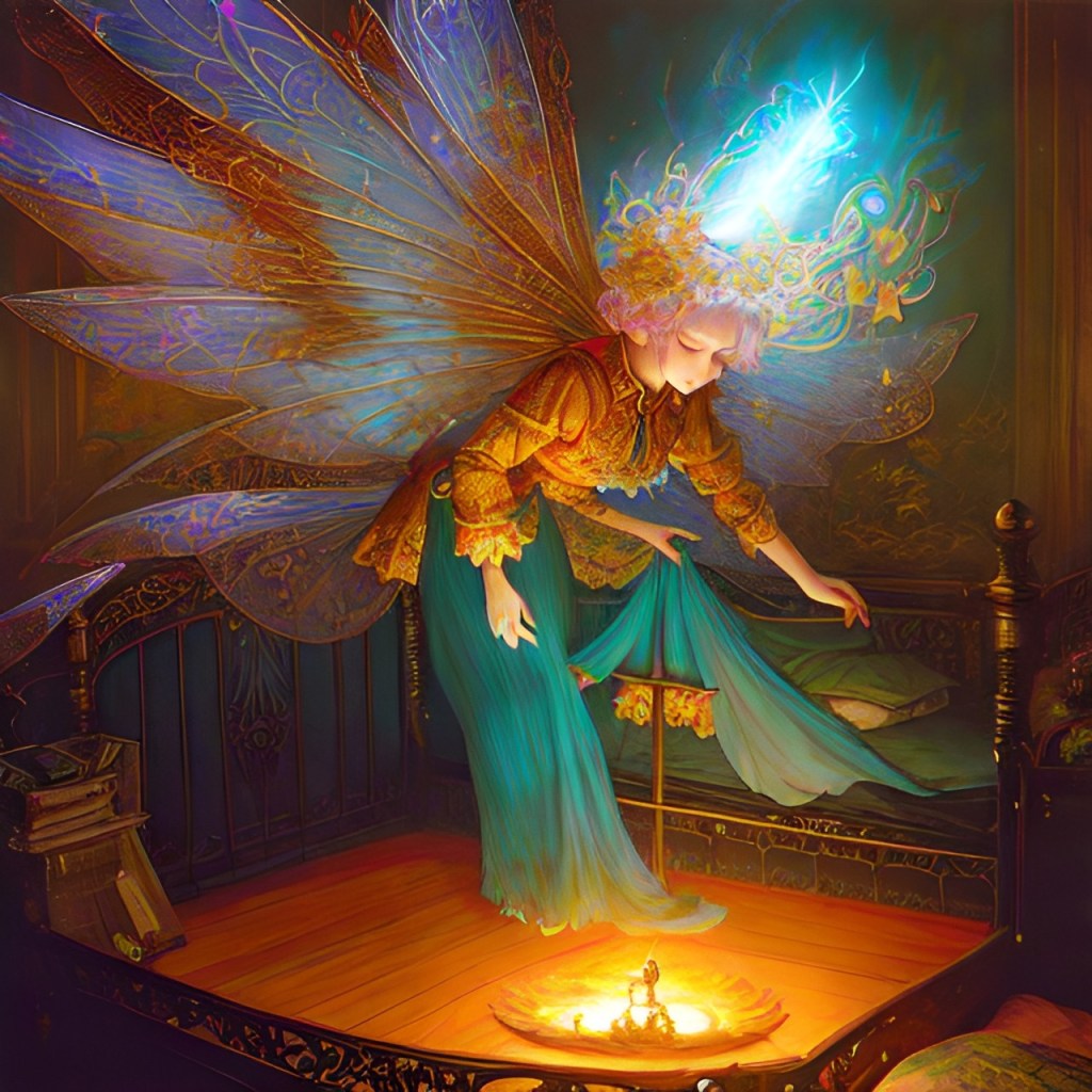 The Ghost of Christmas Past, a gentle and radiant fairy, fills the bed chamber with a warm and ethereal glow, the ghostly figure extends her hand towards the reluctant Scrooge.