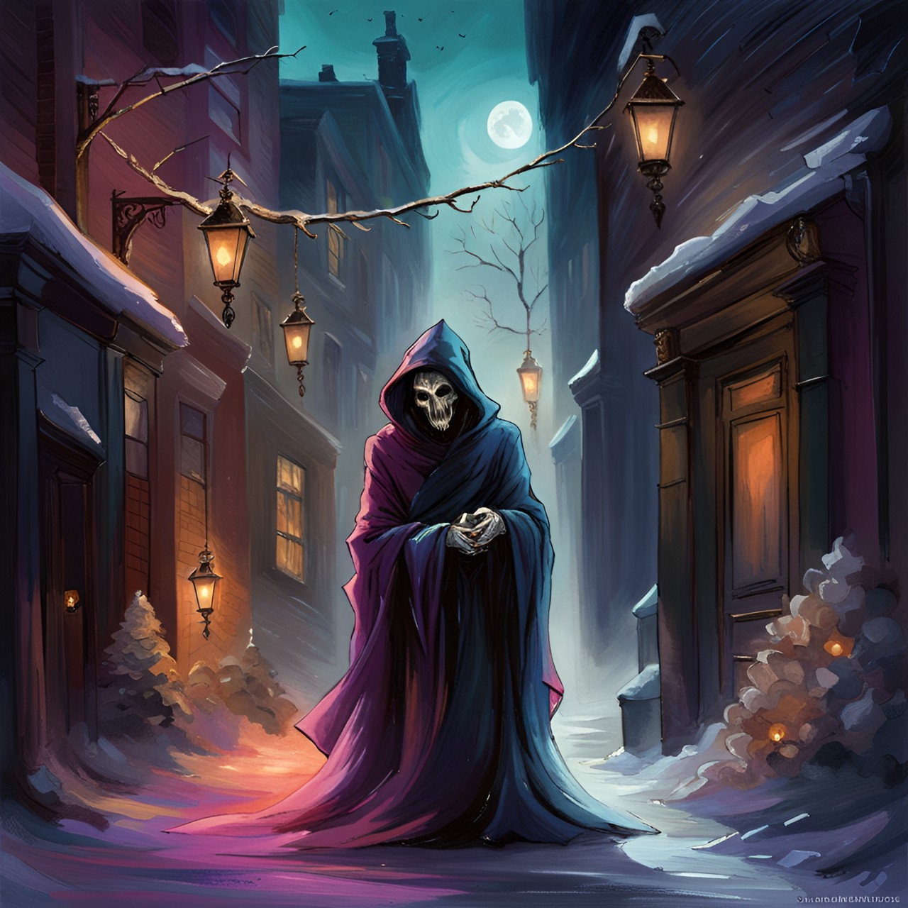 Ebenezer turned to find the towering, terrifying figure of the Ghost of Christmas Future, silently pointing through the thick fog engulfing the cobblestone streets. His bony finger directs Scrooge’s attention towards huddled individuals who are rummaging through boxes of old clothes and linens, next to piles of broken furniture. Their voices carried disdain and bitterness across the air as they spoke ill of a recently deceased rich boar,