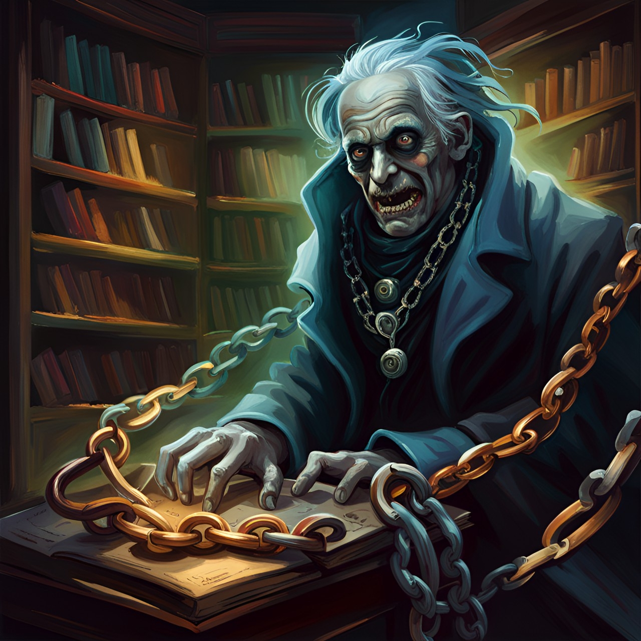Scrooge found himself alone, finally, as far as he was concerned. No more distractions. Scrooge counted coin and notated his ledger. But his eyes drew heavy. The low hypnotic crackle of the coal stove, and the dancing light of the single candle lulled Scrooge to sleep at his desk. A sudden whistling draft blew out the candle and what remained of the smoldering coal. Still asleep, Scrooge’s breath became visible in the growing chill of night. Sounds of chains dragging, footsteps slowly nearing and haunting moans crescendoing caused Ebenezer to slowly wake, eyes still closed, half engrossed in nightmare, and growing awareness of a real presence, mumbling, “No! Begone, demon! Leave me alone!”